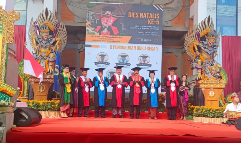 Bangli (UHN Sugriwa) – Universitas Hindu Negeri (UHN) I Gusti Bagus Sugriwa Denpasar, Bali, kembali melahirkan lima Guru Besar. Pengukuhan para Guru Besar oleh Rektor, Prof. Dr. Drs. I Gusti Ngurah Sudiana, M.Si dirangkai dengan momentum puncak Dies Natalis V yang digelar di kampus Bangli, Minggu (25/5/2025).