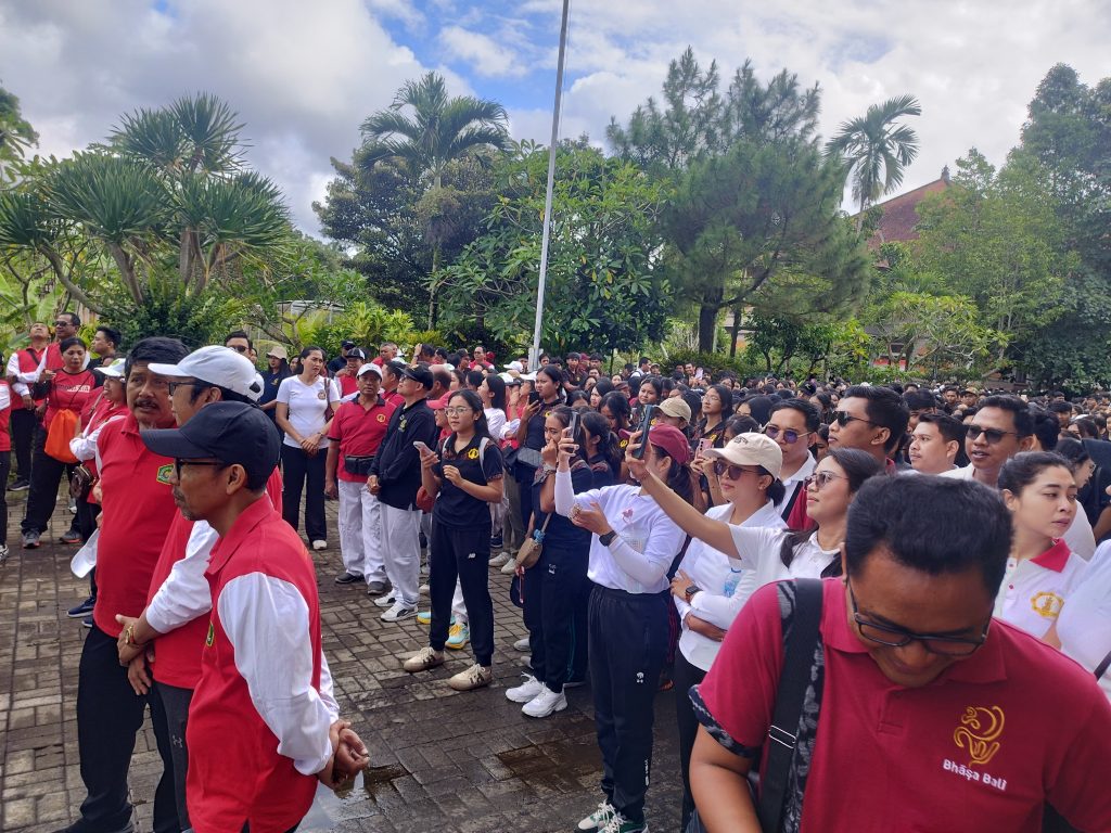 “Kegiatan hari ini merupakan bagian dari rangkaian peringatan HAB ke-80. Kita melaksanakan jalan santai sehat di sekitar kampus Bangli, dari kampus melewati rute ke bawah Pucak Hyang Ukir dan kembali ke kampus,” ujar Rektor sesaat sebelum melepas peserta dengan pengibaran bendera start.